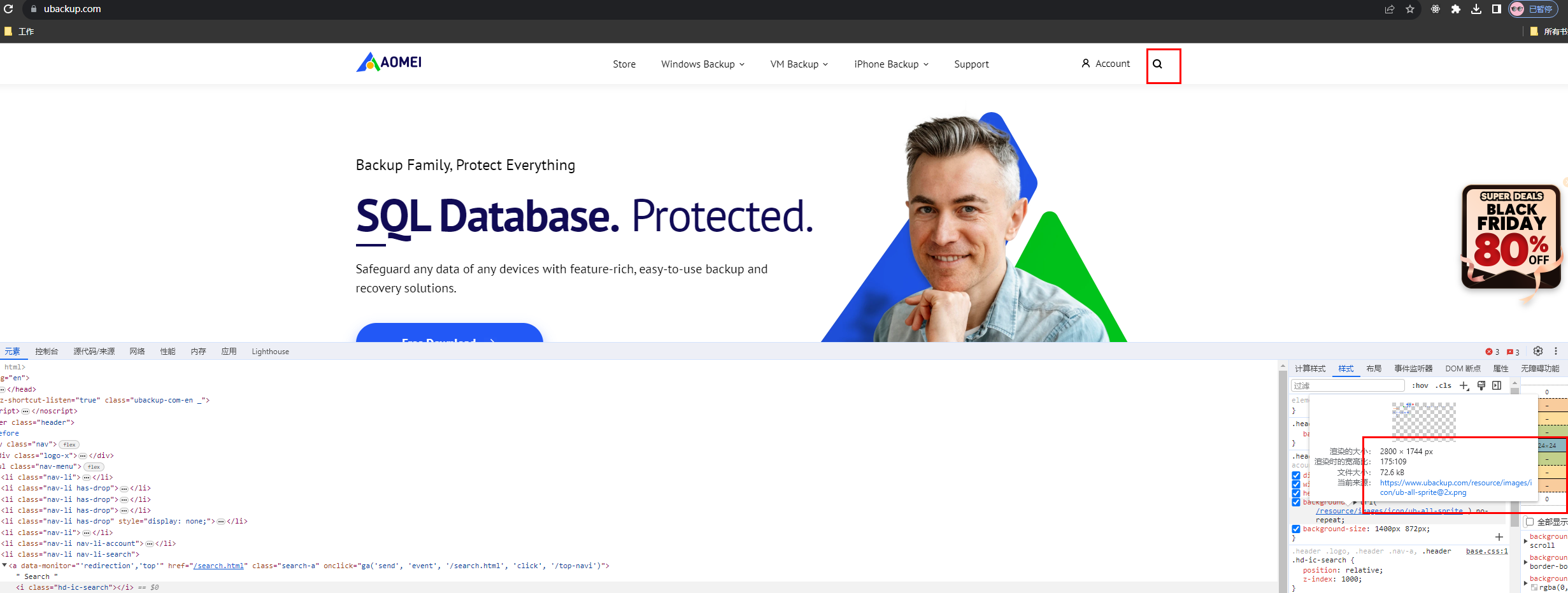 以UB首页为例,如下图,我使用了一个搜索的icon,这里却需要引入一张70多kb的图片,而这张精灵图的其他的icon在当前网页中并没有使用,因此对于此类较小的icon图,推荐单个的svg图或者.webp图