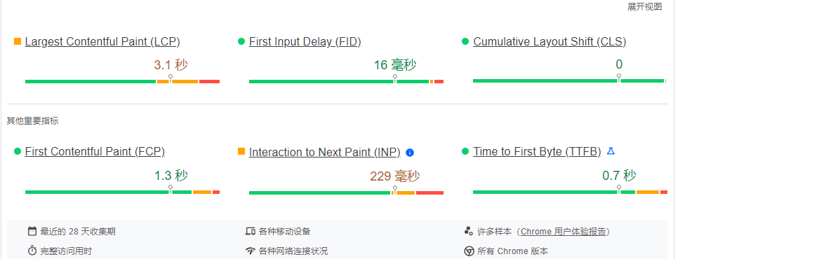 - First Input Delay (FID) (首次输入延迟):衡量页面的交互性,表示用户首次与页面交互(点击链接、按钮等)到浏览器实际响应的时间。理想情况下,FID应在 100 毫秒以内。